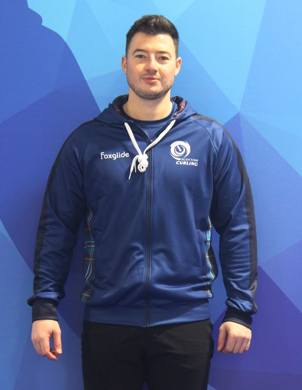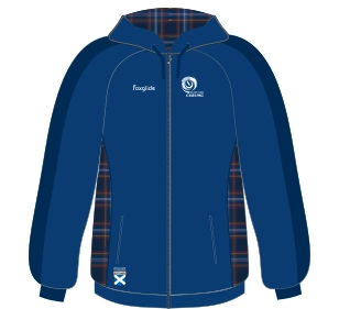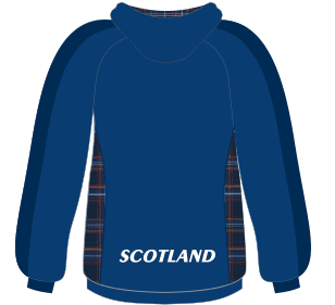 The hoodie features the traditional blue of Scotland, together with a digital reproduction of the Strathcona Tartan, the official tartan of the Royal Caledonian Curling Club, inside the hood and on the side panels. On the front the hoodie includes a printed version of the Scottish Curling logo over the heart, and on the back SCOTLAND in the official font style.