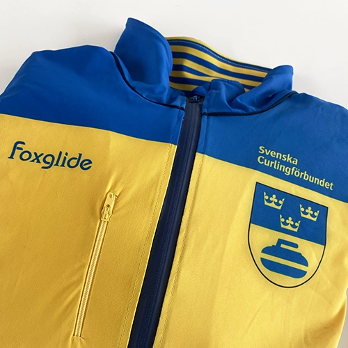 Sweden sample Curling jacket. printed in Sweden yellow and blue with federation logo to front .